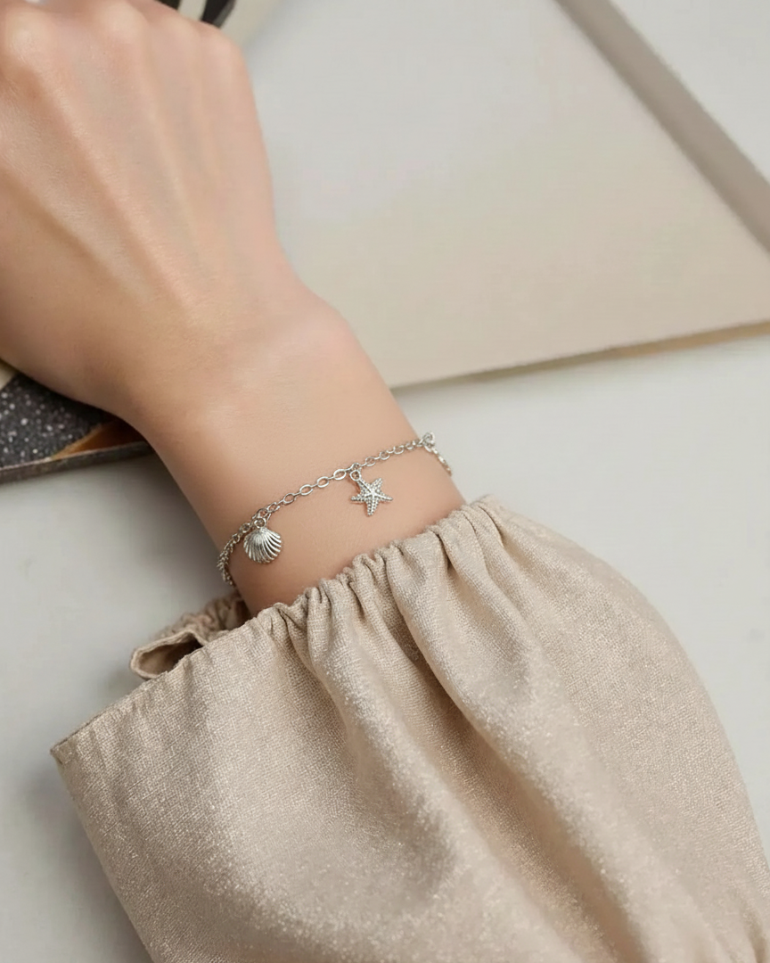 Adaugă un plus de rafinament fiecărei apariții cu această brățară fină din argint 925 STARFISH AND SHELL, creată cu atenție la detalii și finisată cu un luciu impecabil. Designul delicat o face ușor de integrat în orice ținută, de zi sau de seară, oferind un aer elegant și modern.