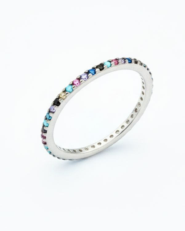 Adaugă o notă de culoare şi rafinament colecţiei tale cu acest inel elegant din argint 925, placat cu rodiu, decorat cu o bandă continuă de cristale multicolore („rainbow”) ce reflectă lumina în nuanţe vibrante. Designul tip band îl face perfect pentru purtare zilnică, dar şi pentru ocazii speciale când vrei să atragi priviri.